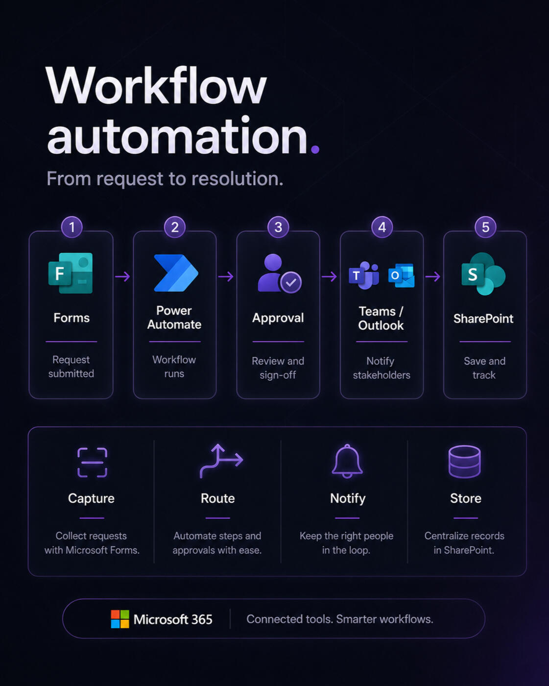 Turn one repetitive admin process into a working Microsoft 365 workflow.For UK SMEs that need one admin process automated without committing to a large project.Ideal for request trackers, approval flows, form-to-SharePoint workflows, Teams/email notifications, simple onboarding steps, and basic Power Automate builds.